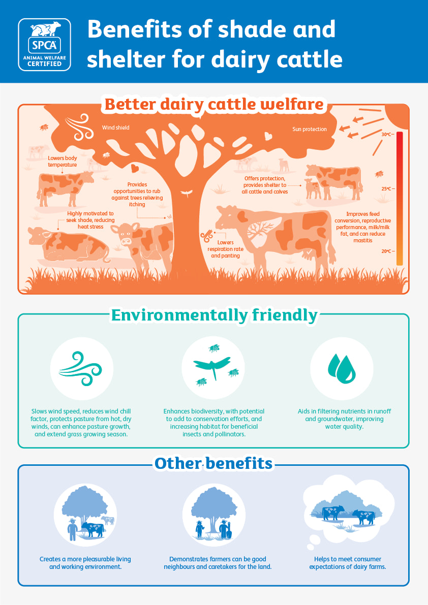 SPCA Certified standards for beef and dairy cattle explicitly require access to shade and shelter for cattle at all times so the animals can manage their own temperature requirements to avoid discomfort and heat and cold stress. This goes further than the legal minimum standards.